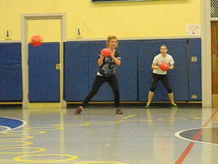 Chrissy McFadden (left) and Katie Williams (right) compete in the LTS dodgeball playoffs. (Photo credit: Madison Ornstil)